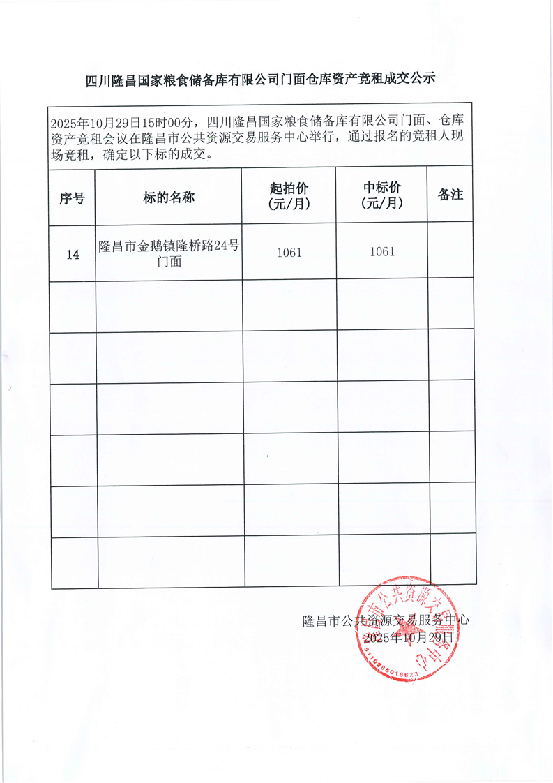 LCJY(2025)C076四川隆昌国家粮食储备库有限公司门面、仓库资产竞租成交公告