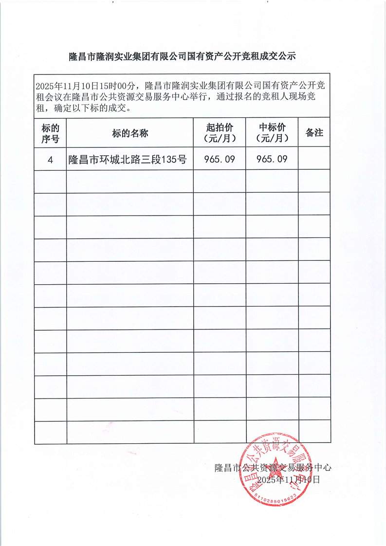 LCJY(2025)C078隆昌市隆润实业集团有限公司门面资产竞租成交公告