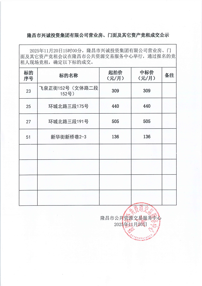 LCJY(2025)C079隆昌市兴诚投资集团有限公司营业房、门面及其它资产竞租成交公告