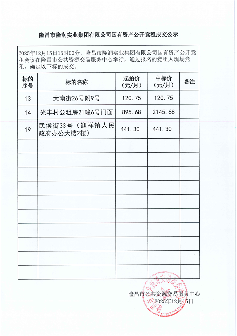 LCJY(2025)C087隆昌市隆润实业集团有限公司门面资产竞租成交公告