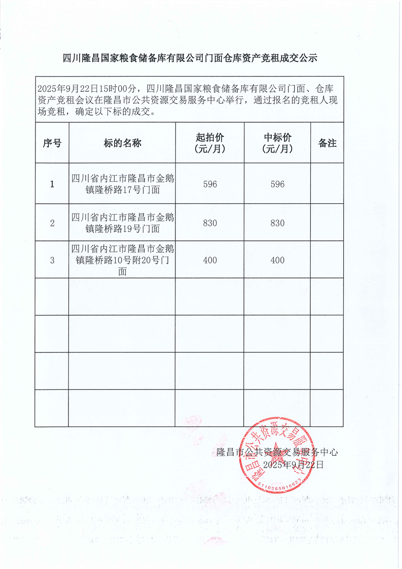 LCJY(2025)C070四川隆昌国家粮食储备库有限公司 门面、仓库资产竞租成交公示
