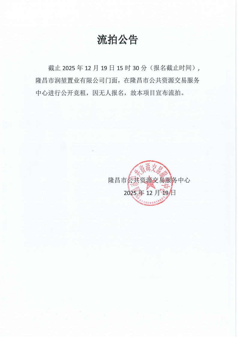 LCJY(2025)C088隆昌市润堃置业有限公司门面租赁流拍公告