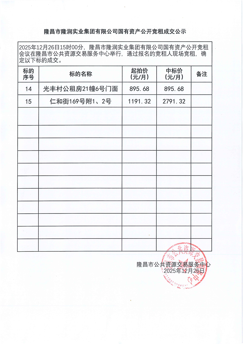 LCJY(2025)C090隆昌市隆润实业集团有限公司门面资产竞租成交公告